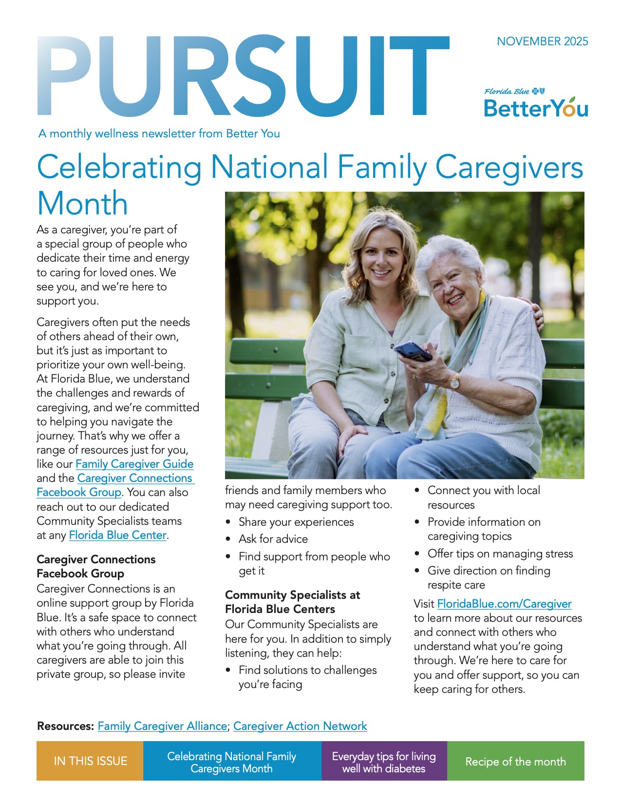 At Florida Blue, we shine a spotlight on the importance of education, prevention, and support. In this month’s wellness news, we’ll explore tips and trends to help you navigate the season with ease, from managing stress and maintaining a balanced diet to prioritizing self-care, especially if you are a caregiver, and staying physically active during the cooler months.