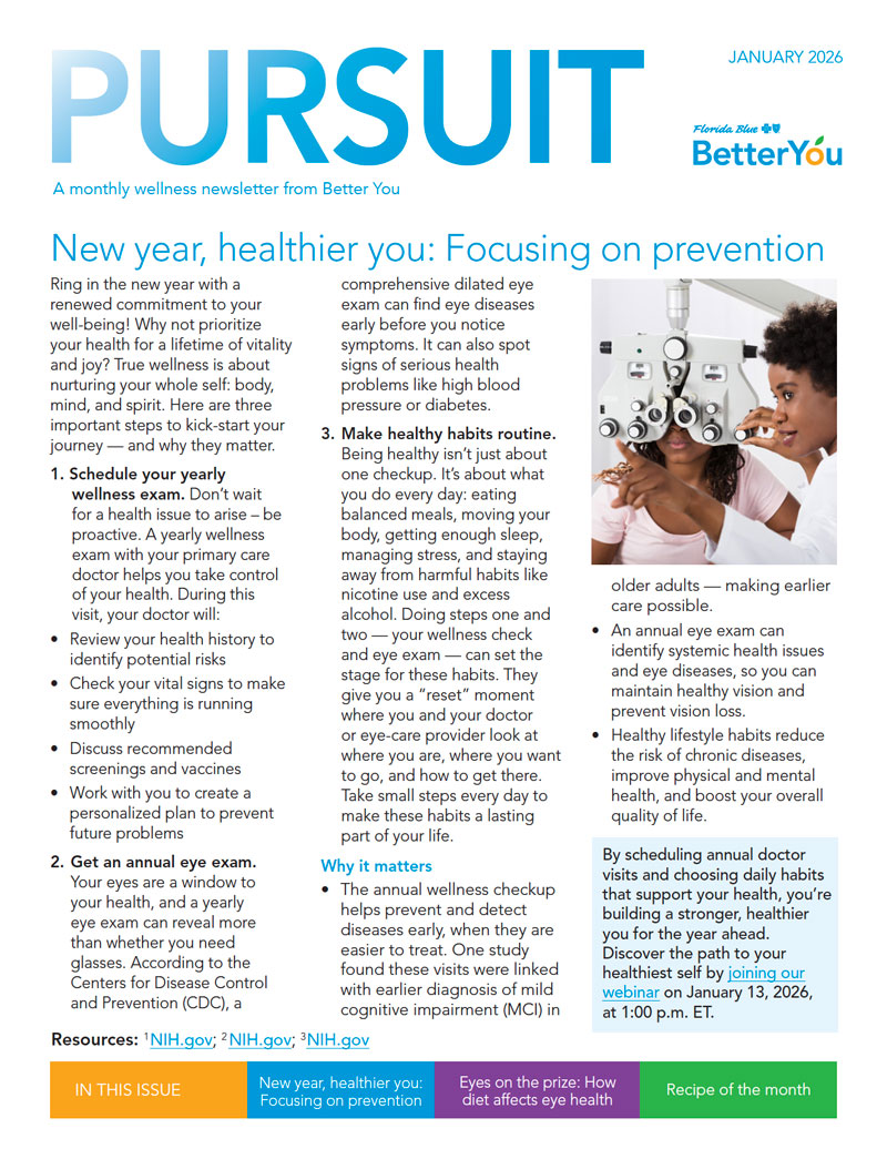 A new year offers a fresh start and a chance to think through priorities and goals. It is a great time to reset and root yourself in routine behaviors that keep you feeling happy and well. Small, healthy lifestyle changes can lead to habits that last a lifetime. The smaller the change, the easier it is to sustain. Don’t shoot for perfection! Aim at consistency instead. This month, your Florida Blue team helps you get off to a good start with education, guidance, resources, and support to achievable goals for lasting results. Spoiler alert: combining self-care with preventive care are the two most important habits for achieving better health.